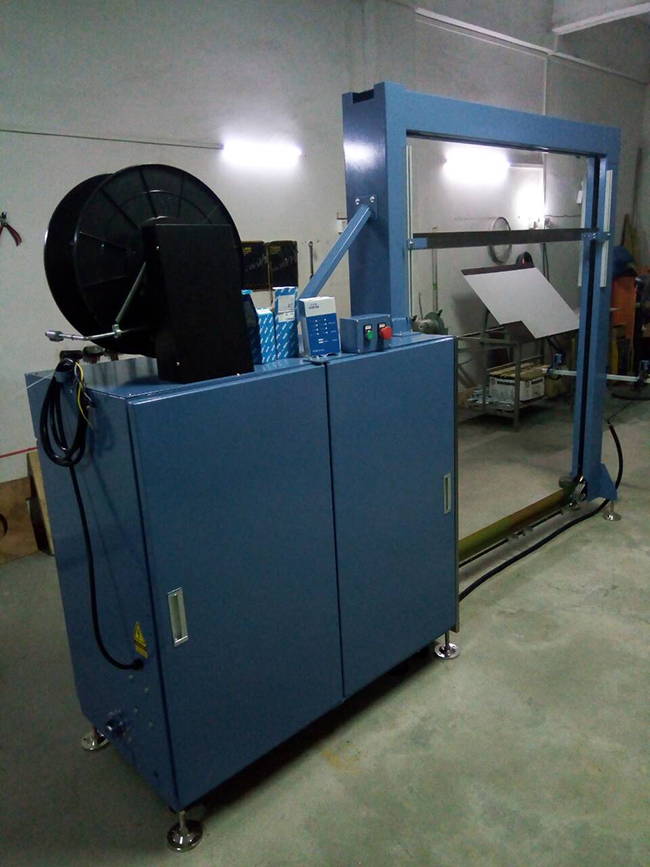 開放式弓架活動的穿帶能將棧板與捆包物牢固地捆包在一起便于移動及運輸,堆滿產品的棧板通過輸送滾筒線可實現無人化捆包生產線。