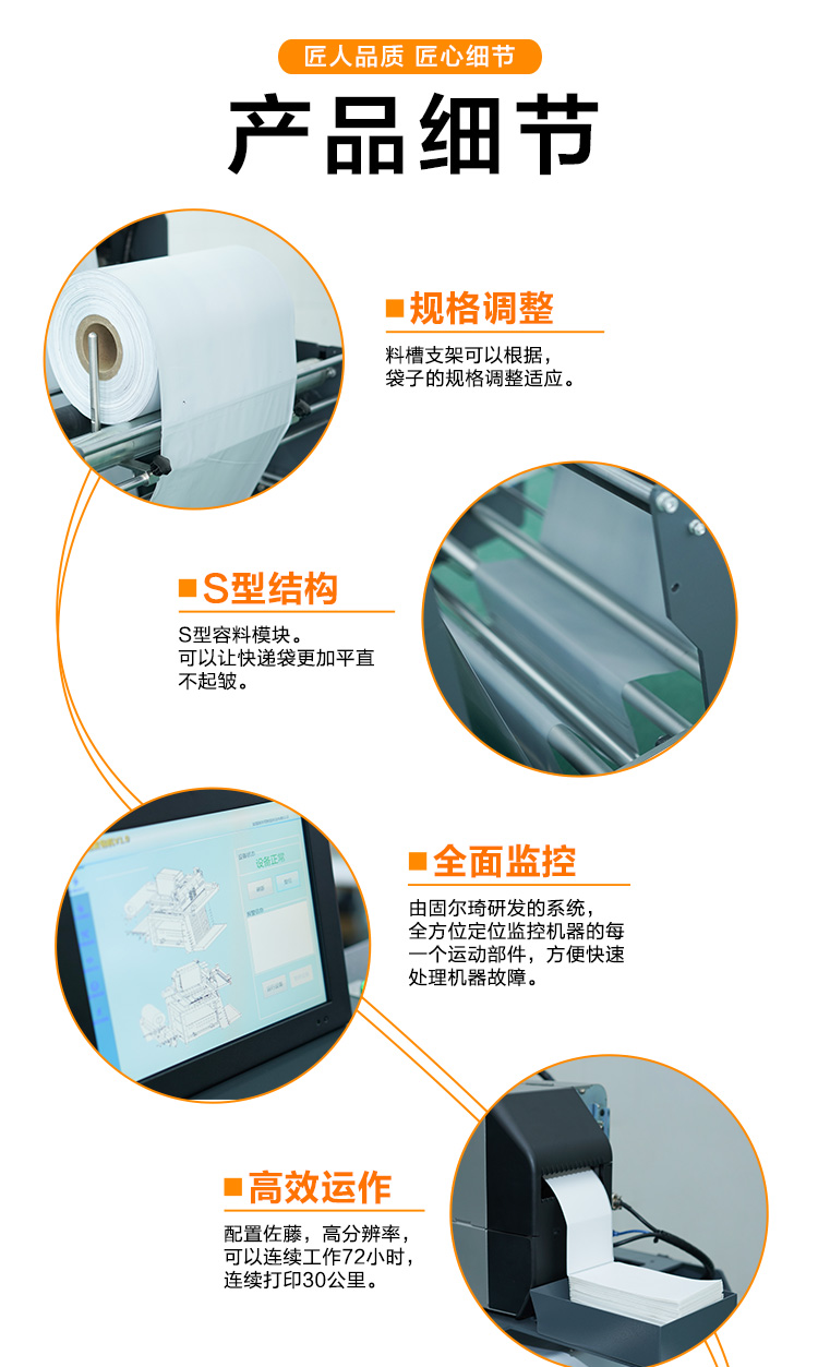 該智能化快遞打包機,該設備將是自動化包裝機械設備行業的里程碑之作,智能快遞打包系統可以提供貨品掃碼、貨品稱重、套裝塑料袋、對塑料袋自動封口、自動打印面單、自動粘貼面單以及貨品自動輸送等一體化解決方案。同時,可根據客戶需要,自動對接電商訂單和企業ERP 或 WMS 系統,為客戶提供貨品的塑料袋包裝發貨整體解決方案。